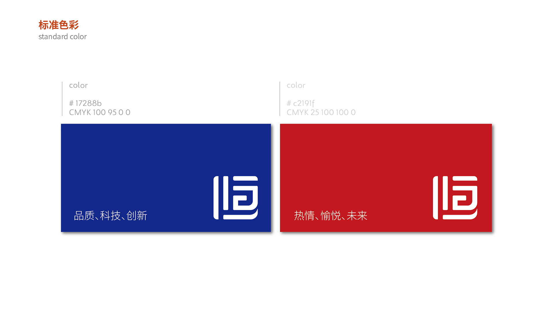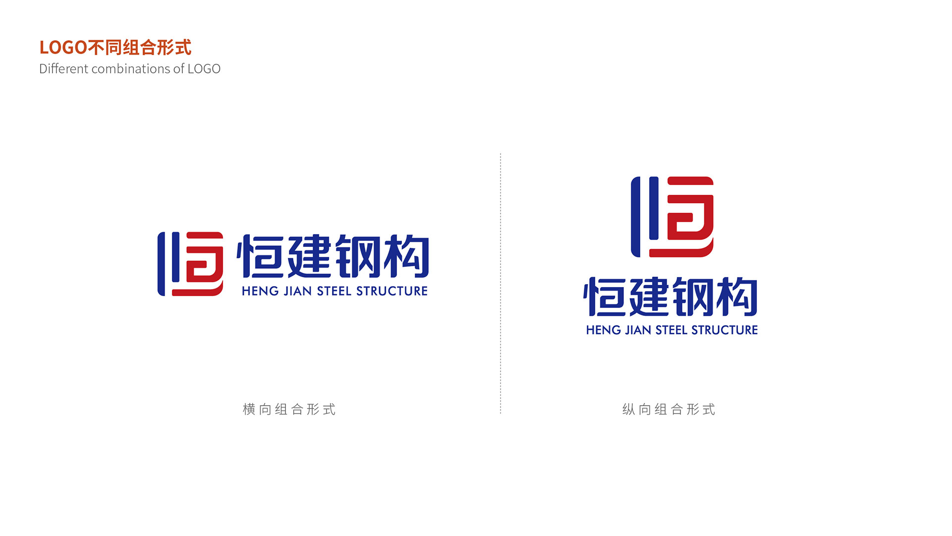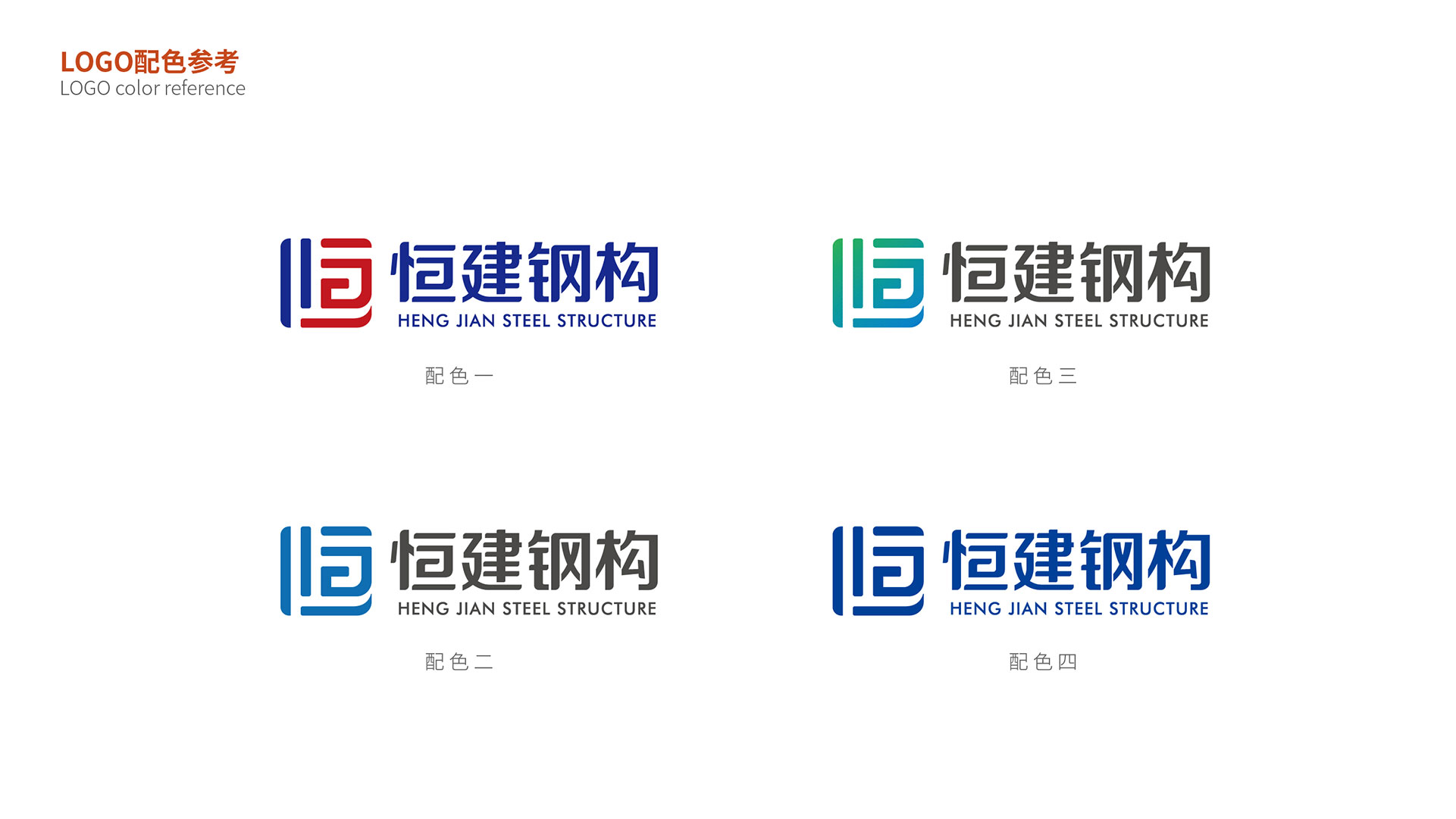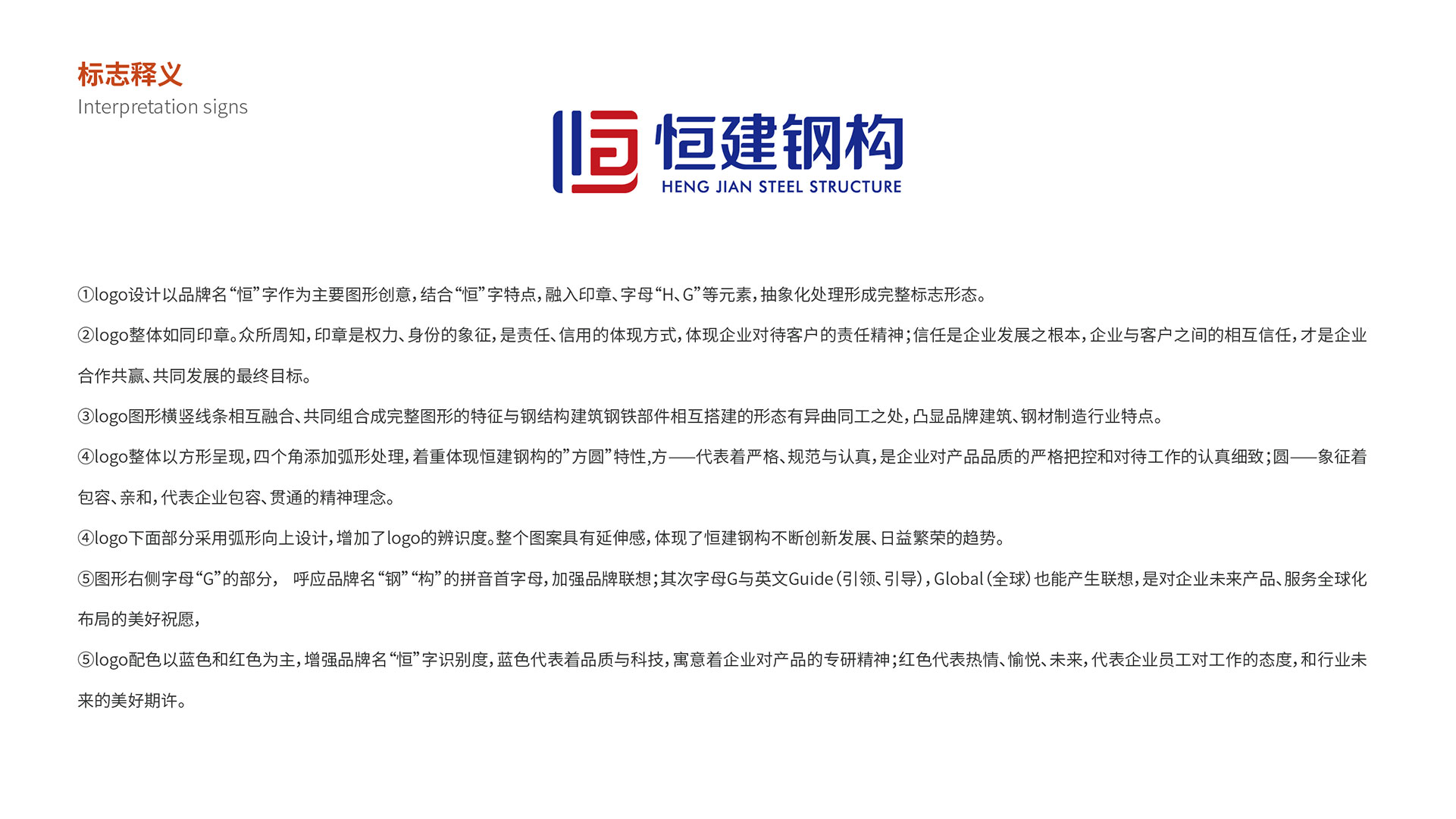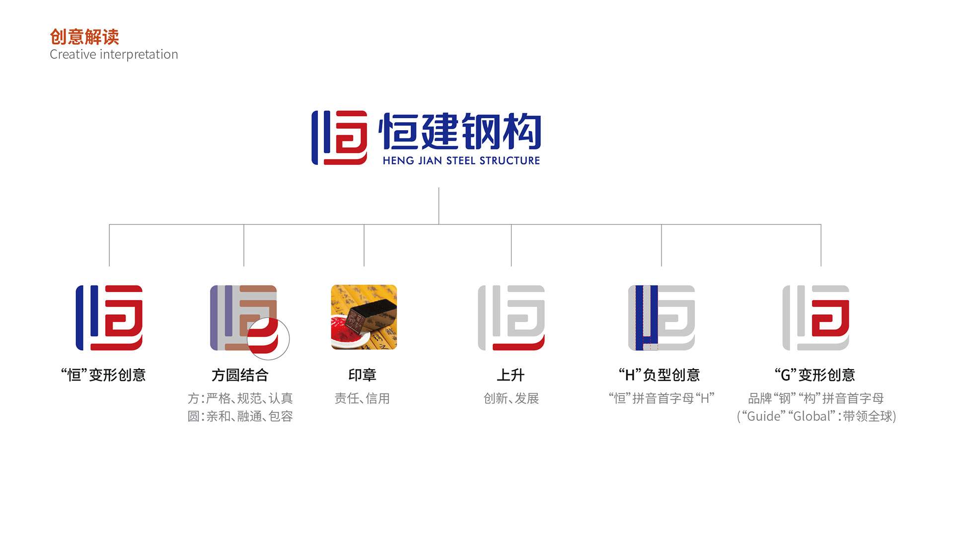 logo設(shè)計以品牌名“ 恒" 字作為主要圖形創(chuàng)意, 結(jié)合“ 恒” 字特點, 融入印章、字母"H 、G ” 等元素, 抽象化處理形成完整標志形態(tài)。 logo整體如同印章。眾所周知, 印章是權(quán)力、身份的象征, 是責(zé)任、信用的體現(xiàn)方式, 體現(xiàn)企業(yè)對待客戶的責(zé)任精神; 信任是企業(yè)發(fā)展之根本, 企業(yè)與客戶之間的相互信任, 才是企業(yè)合作共贏、共同發(fā)展的最終目標。 logo圖形橫豎線條相互融合、共同組合成完整圖形的特征與鋼結(jié)構(gòu)建筑鋼鐵部件相互搭建的形態(tài)有異曲同工之處, 凸顯品牌建筑、鋼材制造行業(yè)特點。 logo整體以方形呈現(xiàn), 四個角添加弧形處理, 著重體現(xiàn)恒建鋼構(gòu)的" 方圓" 特性, 方一一亻弋表著嚴格、規(guī)范與認真, 是企業(yè)對產(chǎn)品品質(zhì)的嚴格把控和對待工作的認真細致; 圓一. 一象征著包容、親和, 代表企業(yè)包容、貫通的精神理念。