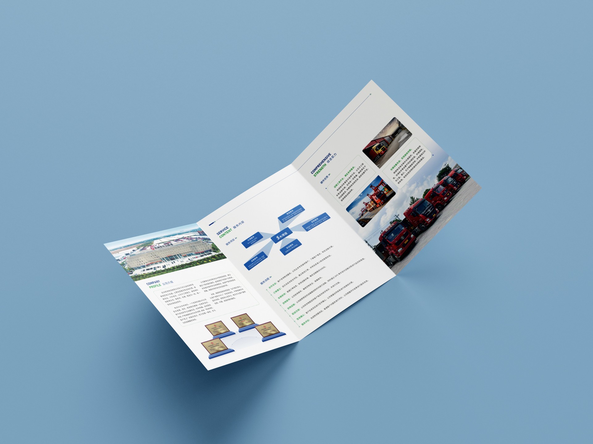 折頁內(nèi)容包括企業(yè)文化、企業(yè)概況、服務(wù)項(xiàng)目流程、綜合實(shí)力等,展示公司的軟硬件優(yōu)勢(shì),突出公司實(shí)力。