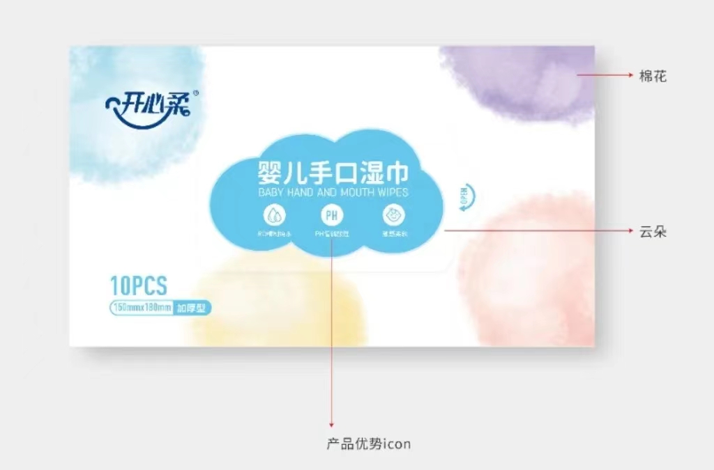 與一般嬰兒濕布相比,嬰兒手口濕巾殺菌和消毒作用更強(qiáng),手口濕巾受到廣大消費(fèi)者的歡迎,開心柔嬰兒手口濕巾采用新型技術(shù),觸感柔軟舒適,PH值更貼近嬌嫩肌膚,為了能夠拉近與消費(fèi)者的距離,擴(kuò)大產(chǎn)品銷量,增強(qiáng)品牌影響力,石特受委托為嬰兒手口濕巾設(shè)計包裝。