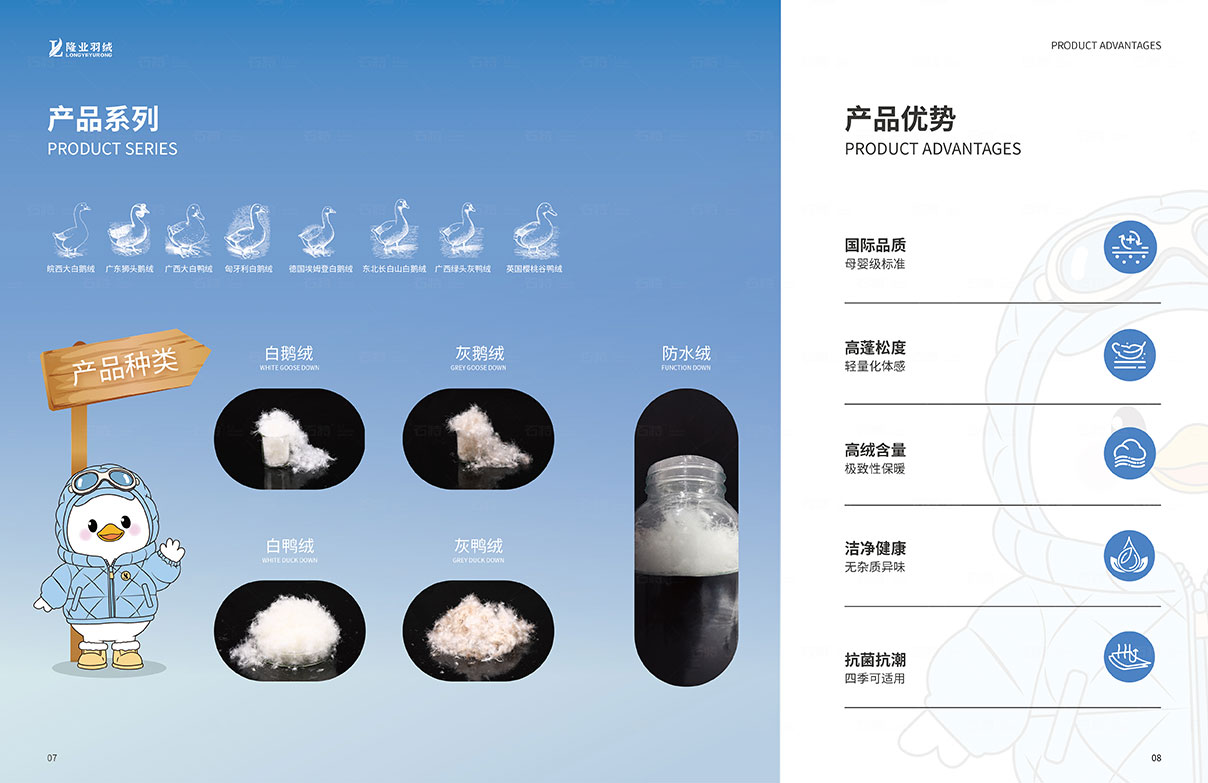 設(shè)計階段,團(tuán)隊以 “簡約大氣、凸顯質(zhì)感” 為原則,將羽絨制品的柔軟屬性與企業(yè)的專業(yè)形象相融合。在色彩選擇上,采用淺色系為主色調(diào),搭配品牌特色色作為點綴,營造舒適、高端的視覺氛圍;在版式設(shè)計上,注重信息層級的清晰呈現(xiàn),通過合理的留白、圖文配比,讓讀者能夠輕松獲取關(guān)鍵信息,同時融入羽絨紋理、羽毛等元素作為設(shè)計細(xì)節(jié),強化品牌辨識度。