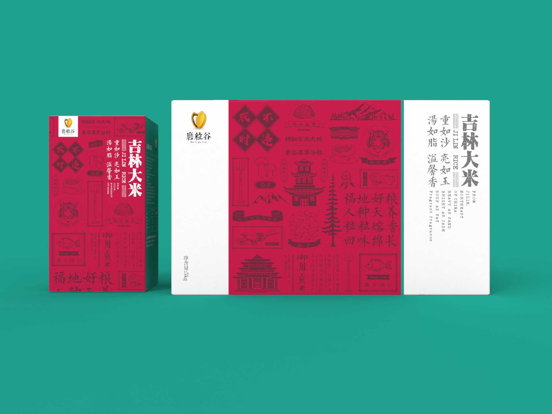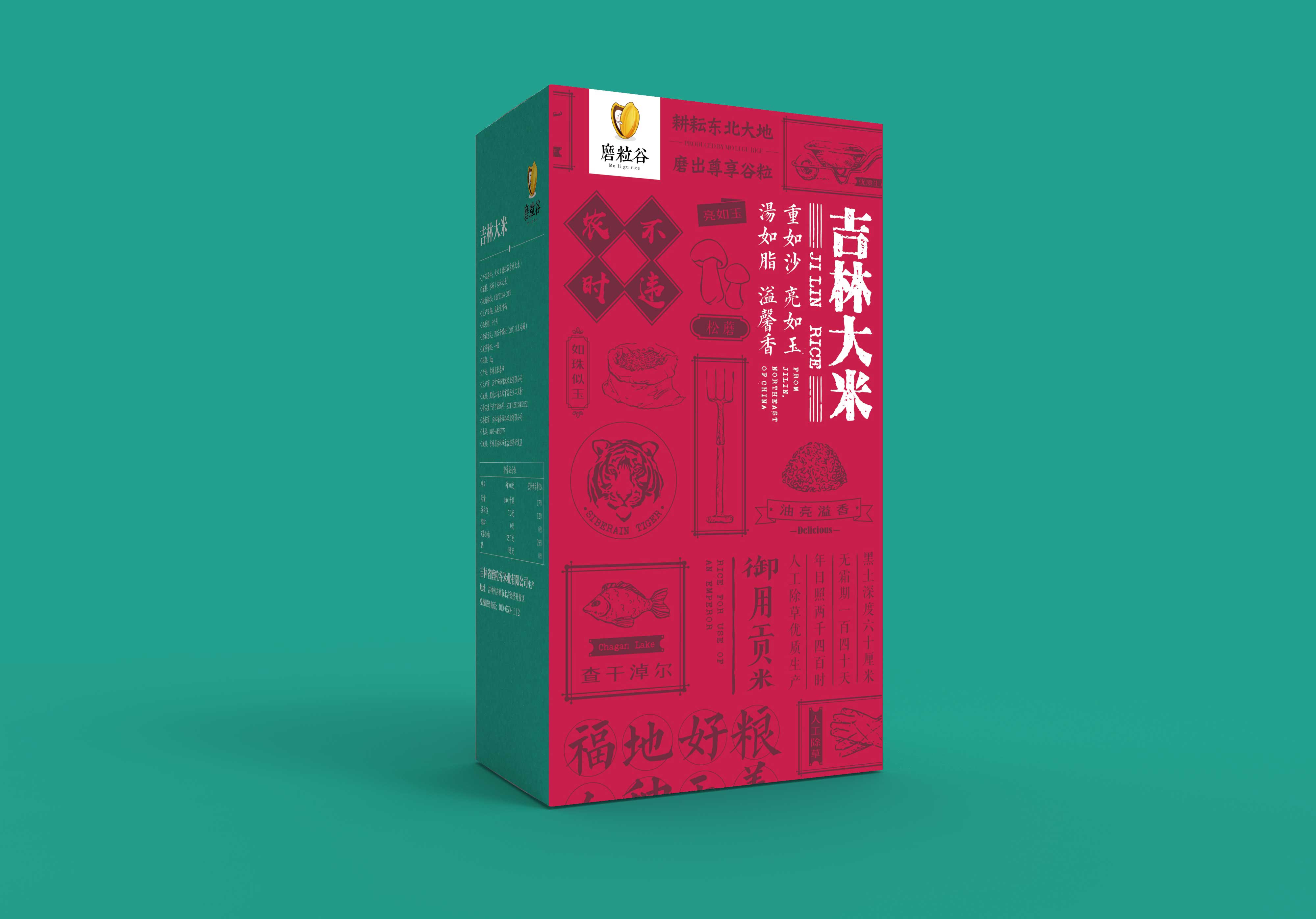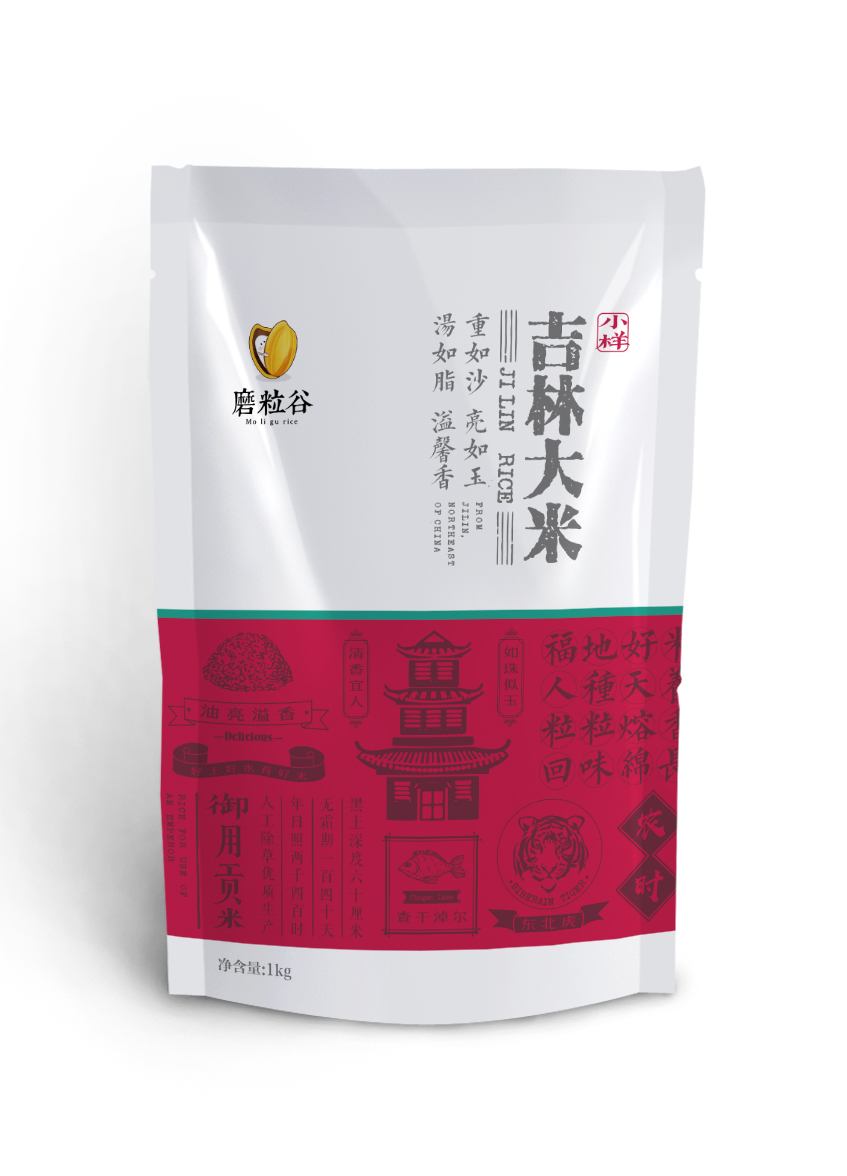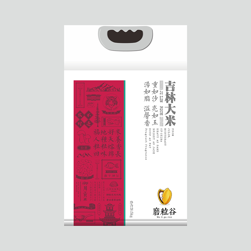 做最好產地的米,分享自然的味道,是磨粒谷米業的品牌理念。我們將這一理念融合進包裝里,整個系列的產品包裝畫面都運用自然的元素去拼接,把屬于大米的那份天然的濃香傳達給客戶。部分產品包裝上運用了地域元素拼貼+撞色,將東北虎、查干湖和松磨這些具有代表性的元素進行拼貼,再加上深沉的紅色做烘托給人強烈的年代感和悠久感。