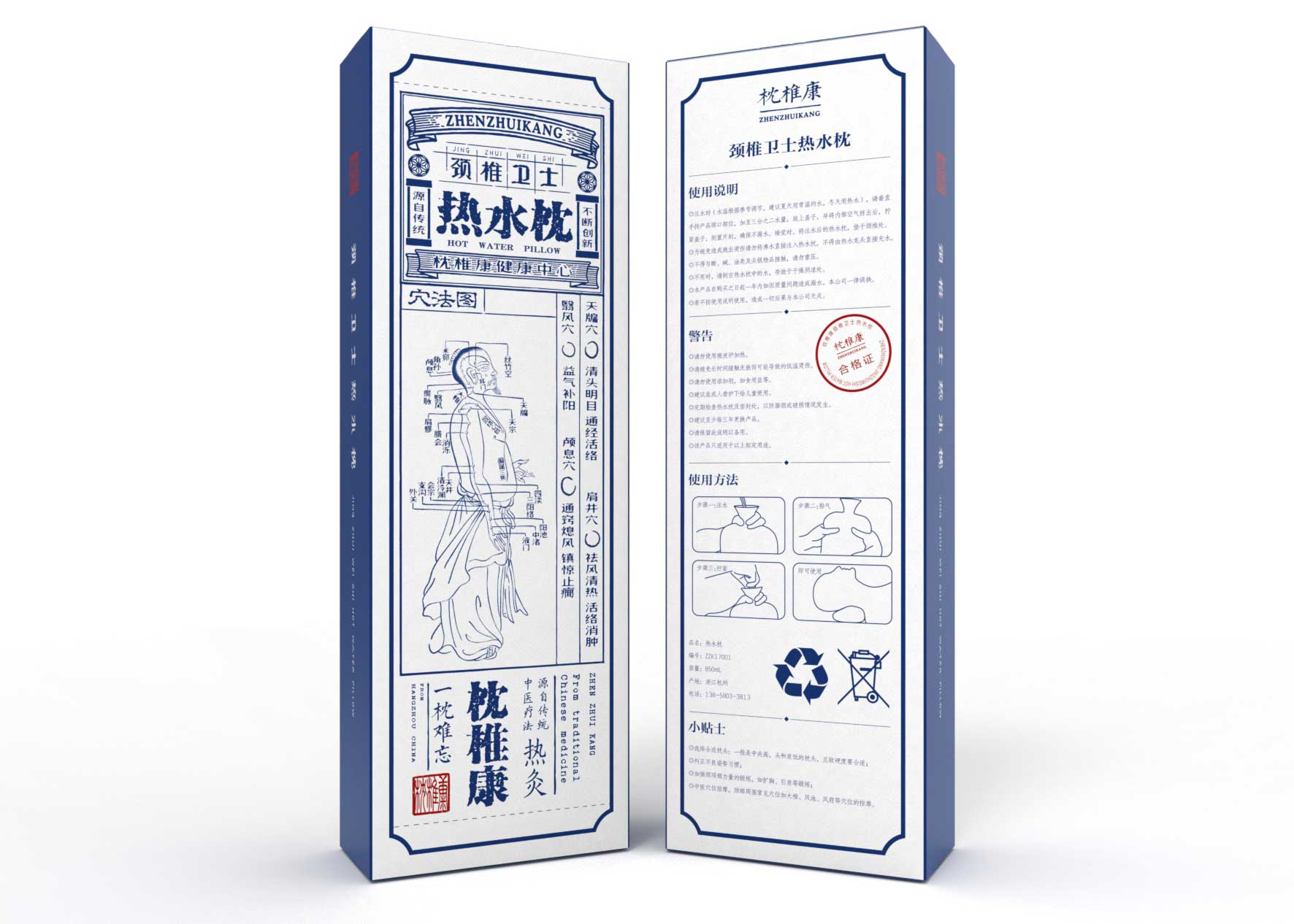 包裝上繪有人體穴法圖,將傳統的中醫療法淋漓盡致的表達出來,同時繪有使用方法示意圖,這樣購買者使用比較方便。除了使用說明及警告這些常規文字產品包裝上還放有頸椎小貼士讓購買者感覺既貼心又實用。產品包裝主題顏色是藍色,向購買者傳達一種健康的理念。