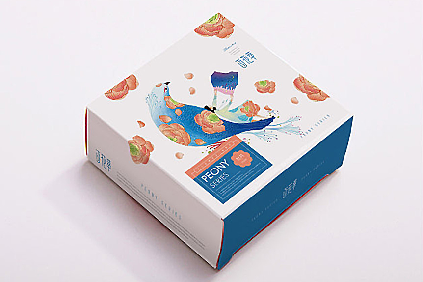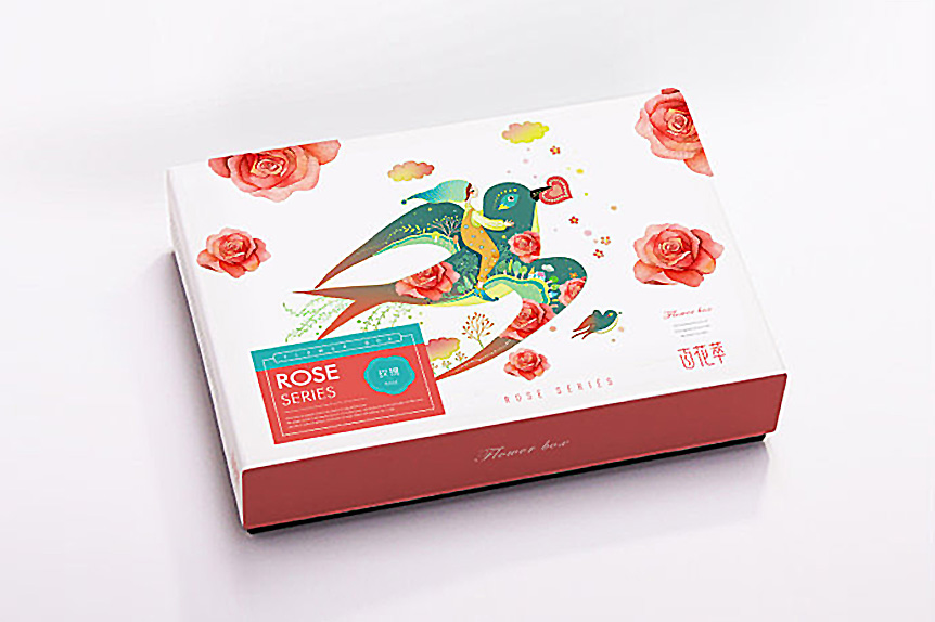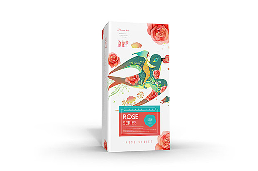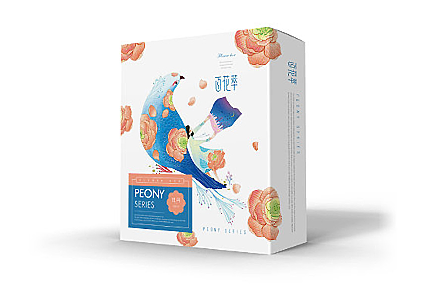 百花萃護膚品在產品包裝上,logo字體變形給人一種文化韻味,Penoy和Rose系列包裝的畫面是分別以牡丹和玫瑰散落在小女孩和小鳥的四周,小女孩坐在鳥上,給人一種與自然融為一體的感覺。而牡丹和玫瑰的花瓣使Penoy和Rose系列產品得以區分,這一包裝設計使得百花翠系列產品神似而形不似在視覺上給人整體性。